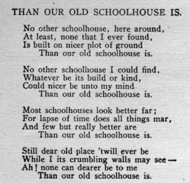 A poem titled, Than Our Old Schoolhouse Is. This is one of the poems contained in a book of poems entitled, SCHOOL POEMS, written by John Tilden Latta and published in 1901 by the Express Print, Newark, Ohio