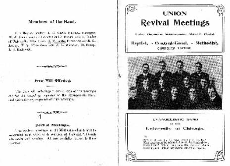 In l904 John Tilden Latta s address was 52 M.D. Middle University Hall. He was a member of the 13-member Evangelistic Band of the University of Chicago. Above is a photo of a three-day program and picture of the evangelistic band that was taken around 1904. John is the second from the left in the front row.